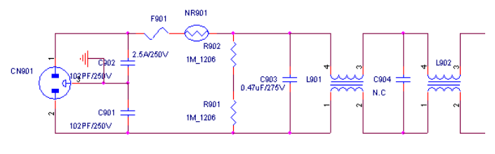 c901、C902為共模電容,首要按捺差模攪擾,即前方和零線別離與地之間的攪擾。電容值愈大對低頻攪擾按捺作用愈好,在這里選用102PF /250V。