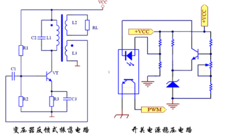 在談開關(guān)電源之前,先了解一下變壓器反應(yīng)式振動電路,能發(fā)生有規(guī)律的脈沖電流或電壓的電路叫振動電路,變壓器反應(yīng)式振動電路便是能滿足這種條件的電路;它由基本放大電路與一個反應(yīng)回路組成,其間 C2、Ll組成一個并聯(lián)諧振選頻電路,在電路通電的瞬間VT 導(dǎo)通,此時在C2、Ll組成的并聯(lián)諧振電路上發(fā)生非常豐富的諧波,當(dāng)外加頻率和并聯(lián)諧振電路的固有頻率相等時,電路進(jìn)入振動狀態(tài),并經(jīng)過L3反應(yīng)到VT的基極進(jìn)一步放大,終究構(gòu)成有規(guī)律的脈沖電流或電壓輸出到負(fù)載RL上。開關(guān)電源便是環(huán)繞變壓器反應(yīng)式振動電路而設(shè)計,只不過在原來的基礎(chǔ)上增加了一些保護(hù)和操控電路,咱們能夠用剖析振動電路的辦法來剖析開關(guān)電源。