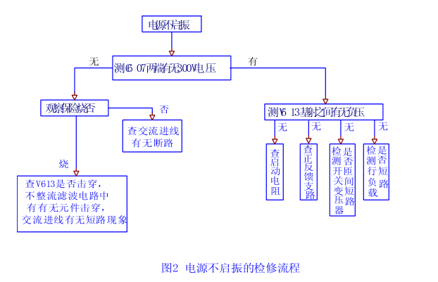 這種情況說明電源不啟振,可按圖2所示的流程進(jìn)行檢修。