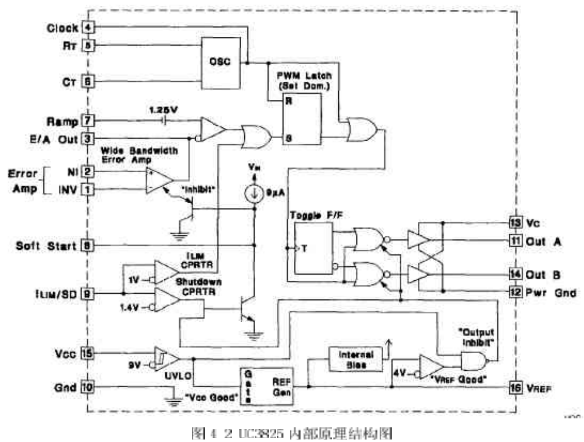 該芯片內(nèi)部電路如圖4-2所示。它由振蕩器、PWM 比較器、限流比較器、過流比較器、基準(zhǔn)電壓源、故障鎖存器、軟啟動電路、欠壓鎖定、PWM鎖存器、輸出驅(qū)動器等組成。我們將詳細(xì)介紹各部分的情況,以理解開關(guān)電源芯片的工作原理。
