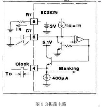 振蕩電路如圖4-3所示。UC3823A、B和UC3825A、B內(nèi)部都有一個鋸齒波振蕩器。鋸齒波上升沿的斜率由RT 、Cr決定,確定RT、CT的方法是:首先根據(jù)要求的最大占空比Dmax、選擇RT,再根據(jù)要求的頻率以及RT和 Dmax選擇CT 計算公式為: