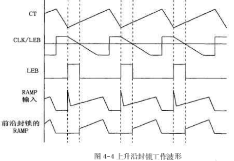 上升沿封鎖工作波形如圖4-4所示,UC3823A、B和UC3825A、B采用固定頻率脈寬調(diào)制。UC3823A、B的兩個輸出端可同時輸出脈沖,輸出脈沖的頻率與振蕩器頻率相等,脈沖占空比可在0%~100%內(nèi)調(diào)整。UC3825A、B的兩個輸出端交替輸出脈沖,因此,每個輸出端輸出脈沖的頻率是振蕩器頻率的1/2,振蕩器的頻率為200KHZ,所以輸出PWM-脈沖的頻率為100KHz,輸出脈沖占空比在0%~一50%以內(nèi)調(diào)整,實(shí)際橋式變換器的應(yīng)用中一般達(dá)不到50%,因?yàn)闃蚴阶儞Q器在PWM脈沖的占空比為50%時,由于功率管截止時間的問題,使得橋臂容易短路,這在以后的部分將詳細(xì)介紹。