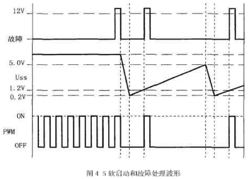 軟啟動和故障處理波形如圖4-5所示。軟啟動是通過軟啟動(SOFT, START)腳的外接電容實(shí)現(xiàn)的。接通電源后,軟啟動腳外接電容放電,該腳處于低電平,誤差放大器輸出低電平,開關(guān)電源無輸出電壓。當(dāng)9uA 的內(nèi)部電流源給軟啟動腳外接電容充電時,誤差放人器輸出電壓逐漸升高,直到閉環(huán)調(diào)節(jié)功能開始T.作,開關(guān)電源輸出電壓逐漸升高到額定值。一旦限流(I LIM)腳的電平超過1.2V,故障鎖存器置位,輸出腳變?yōu)榈碗娖?/span>;同時,軟啟動腳外接電容以250uA的電流放電。在軟啟動電容放完電后,限流腳電平降到1.2V以下時,故障鎖存器就不輸出脈沖。這時,故障鎖存器復(fù)位,芯片開始軟啟動過程。