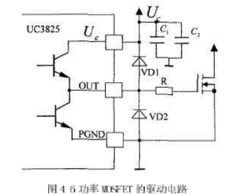 功率MOSFET 驅(qū)動電路如圖4-6所示。UC3825推拉式輸出電路的每個輸出端都可輸出峰值為2A的電流。該輸出電流在20ns內(nèi)可使1000pF電容兩端的電壓上升15V。采用獨(dú)立的集電極電源Uc和功率地線PGND 腳,能夠減小大功率門極驅(qū)動噪聲對集成電路內(nèi)模擬電路的干擾。每個輸出端(OUT)到Uc和 PGND之間,都應(yīng)加入一只3A的肖特基二極管(IN5120,USID245或相同性能的器件),如圖4-6所示。該二極管可將輸出電壓的幅值鉗位在電源電壓,這對任何電感性和電容性負(fù)載都是必要的。