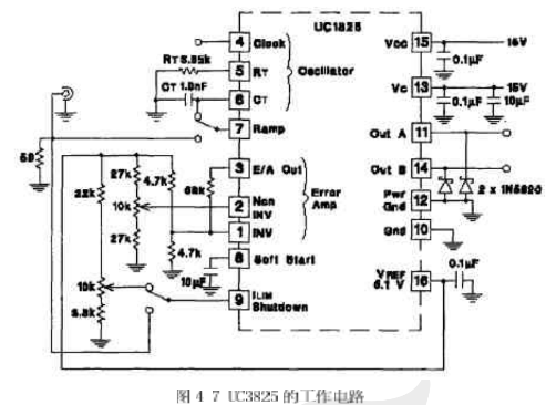 UC3825是開關(guān)電源控制電路的核心,通過前面的介紹,我們知道,這種PWM集成控制器集成了很多的功能,以前需要用分立單元完成的功能,現(xiàn)在都可以通過UC3825來完成,它的-般用法如圖5-7所示。