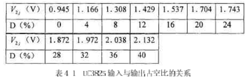 通過實(shí)驗(yàn)可知,UC3825的2腳輸入和outA.、outB輸出的PWM脈沖信號的占空比是滿足線性關(guān)系的。具休實(shí)驗(yàn)數(shù)據(jù)如表4-1所示。我們定義UC3825的2腳輸入為v2,輸出的PM信號占空比為D。從表41中的數(shù)據(jù)可以看出,端口2的數(shù)值范鬧為:0.945V~-2.132v,而 PWM脈沖信號的占空比在0%~-40%之間變化,與上述的結(jié)論是吻合的。