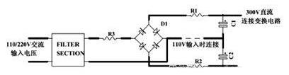 上圖所示為串聯(lián)電阻法沖擊電流控制電路(適用于橋式整流和倍壓電路,其沖擊電流相同),對于110V、220V雙電壓輸入電路,應(yīng)該在R1和R2位置放兩個(gè)電阻,這樣在110V輸入連接線連接時(shí)和220V輸入連接線斷開時(shí)的沖擊電流一樣大。對于單輸入電壓電路,應(yīng)該在R3位置放電阻。