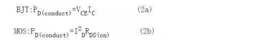 控制這個損耗的典型方法是使功率開關(guān)導(dǎo)通期間的電壓降最小。要達到這個目的,設(shè)計者必須使開關(guān)工作在飽和狀態(tài)。這些條件由式(2a)和式(2b)給出,通過基極或柵極過電流驅(qū)動,確保由外部元器件而不是功率開關(guān)本身對集電極或漏極電流進行控制。