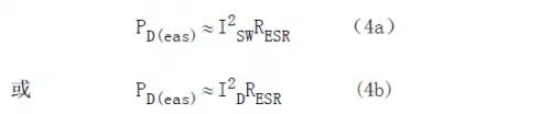 輸入輸出電容是功率開關(guān)或輸出整流器產(chǎn)生的高頻電流的唯一來源(或儲存處),所以通過觀察這些電流波形可以合理地確定流過這些電容ESR的電流。這個(gè)電流不可避免地在電容內(nèi)產(chǎn)生熱量。設(shè)計(jì)濾波電容的主要任務(wù)就是確保電容內(nèi)部發(fā)熱足夠低,以保證產(chǎn)品的壽命。式(4)給出了電容的ESR所產(chǎn)生的功率損耗的計(jì)算式。
