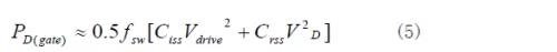 功率MOSFET驅(qū)動(dòng)效率比雙極型功率晶體管高。MOSFET柵極有兩個(gè)與漏源極相連的等效電容,即柵源電容Ciss和漏源電容Crss。MOSFET柵極驅(qū)動(dòng)的損耗來自于開通MOSFET時(shí)輔助電壓對柵極電容的充電,關(guān)斷MOSFET時(shí)又對地放電。柵極驅(qū)動(dòng)損耗計(jì)算由式(5)給出。