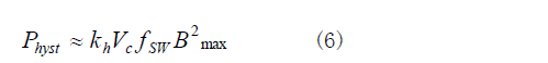 磁滯損耗與繞組的匝數(shù)和驅(qū)動(dòng)方式有關(guān)。它決定了每個(gè)工作周期在B-H曲線內(nèi)掃過的面積。掃過的面積就是磁場力所作的功,磁場力使磁心內(nèi)的磁疇重新排列,掃過的面積越大,磁滯損耗就越大。該損耗由式(6)給出。