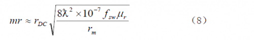 電阻損耗是變壓器或電感內(nèi)部繞組的電阻產(chǎn)生的損耗。有兩種形式的電阻損耗:直流電阻損耗和集膚效應(yīng)電阻損耗。直流電阻損耗由繞組導(dǎo)線的電阻與流過的電流有效值二次方的乘積所決定。集膚效應(yīng)是由于在導(dǎo)線內(nèi)強(qiáng)交流電磁場作用下,導(dǎo)線中心的電流被“推向”導(dǎo)線表面而使導(dǎo)線的電阻實(shí)際增加所致,電流在更小的截面中流動(dòng)使導(dǎo)線的有效直徑顯得小了。式(8)給出了這兩個(gè)損耗在一個(gè)表達(dá)式中的計(jì)算式。