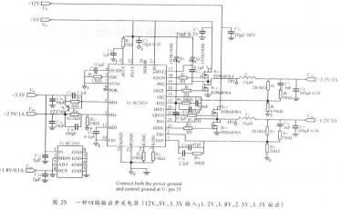 5、開關電源PCB排版例3最后討論一種多路輸出開關電源PCB排版要點。此電源有3組輸入電壓(12V,5V和3.3V),4組輸出電壓(3.3v,2.6V,1.8V,1.2V)。該電源使用了,一集成多路開關控制器(Serotech型號SC2453)。SC2453提供了4.5V~30V的寬輸入電壓范圍,兩個高達700kHz開關頻率和高達15A輸出電流,以及低至0.5V輸出電壓的同步降壓轉換器。它還提供了一個專用可調配正壓線性調節(jié)器和一個專用可調配負壓線性調節(jié)器。TSSOP-28封裝減小了所需線路板面積。兩個異相降壓轉換器可以減小輸入電流紋波。圖25是這種多路開關電源的原理圖。其中3.3V輸出由5V輸人產生,l.2V輸出由12V輸入產生,2.6V和1.8V輸出由3.3V輸入產生。由于該電源上所有元器件都必須被放置在一個面積較小的PCB上,為此必須將電源的功率地層和控制信號地層分隔開來。參照前面幾節(jié)中討論過的要點,首先將圖25中連接到功率地層的元器件和連接到控制信號地層的元器件區(qū)分開來,然后將控制信號元器件放在信號地層上并靠近SC2453控制信號地層與功率地層通過單點相連接。這連接點通常會選擇在控制芯片的接地腳(SC2453中的腳21)。圖26詳細描述了該電源排版方式。