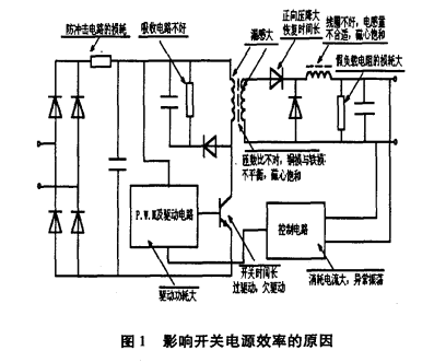 提高并保持開關(guān)電源的效率,直接受開關(guān)電源本身的限制。如電源設(shè)備的小型化主要通過高頻化和高密度化來實現(xiàn),電路內(nèi)的半導(dǎo)體開關(guān)存在著開、關(guān)損耗,而這種損耗與開關(guān)頻率成正比關(guān)系,因此,高頻化會增加半導(dǎo)體開關(guān)的損耗;高密度化也會因散熱面積的減小而導(dǎo)致溫度升高,從而影響開關(guān)電源的效率,也影響它的可靠性。只有提高效率,才是保證開關(guān)電源可靠性的最有效的方法;只有找出使開關(guān)電源效率降低的原因,才能解決提高開關(guān)電源的效率問題1。